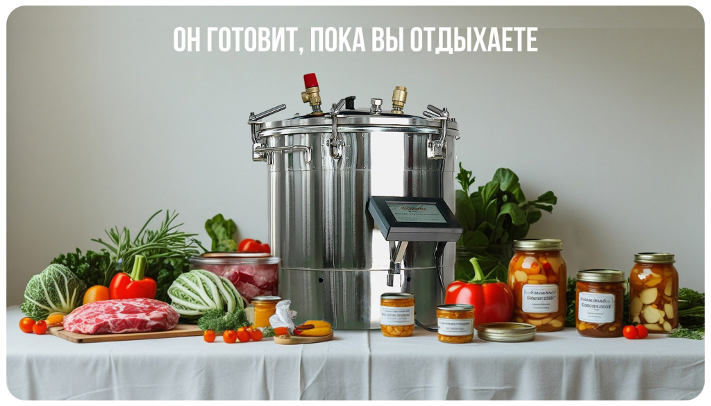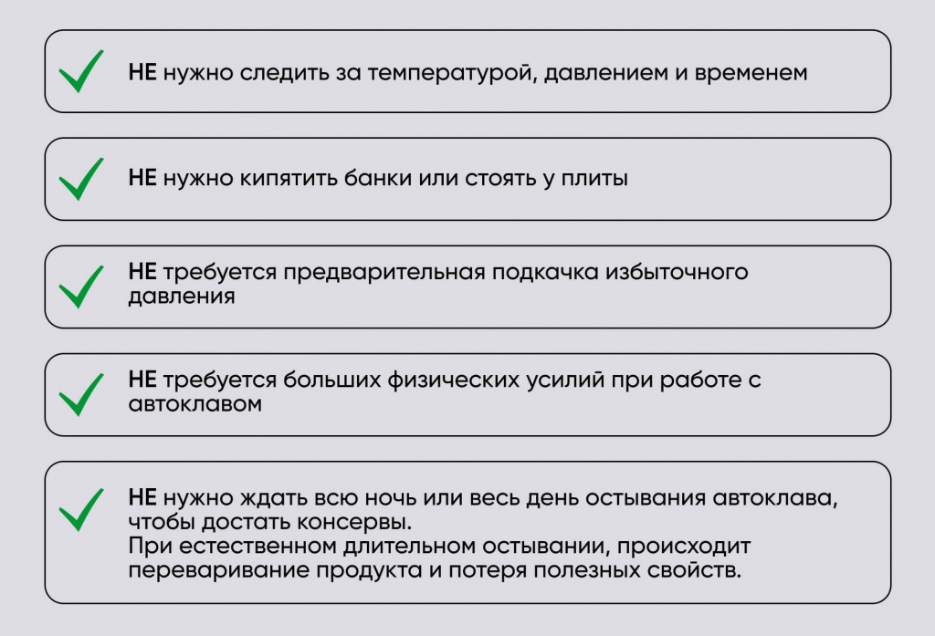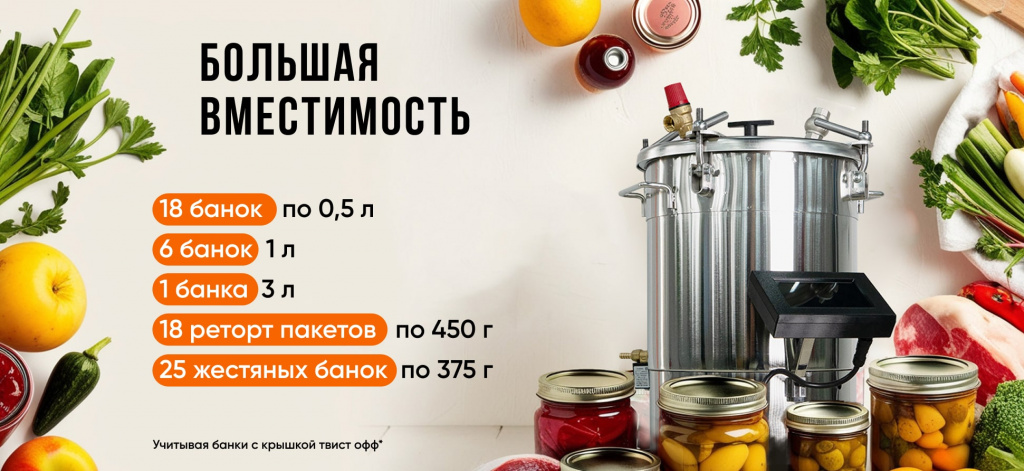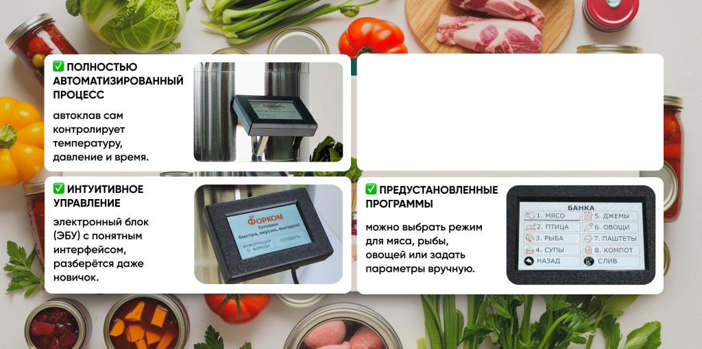 Начинающим подойдут 4 предустановленных режима для рыбы, птицы, мяса, плодов и ягод. Опытные консерваторы могут создавать и запоминать до 10 собственных программ, для любого вида тары в блоке управления. Аппарат поддерживает стабильное давление и температуру, в соответствии с требованиями к консервированным продуктам, позволяя закатывать даже в реторт-пакеты.