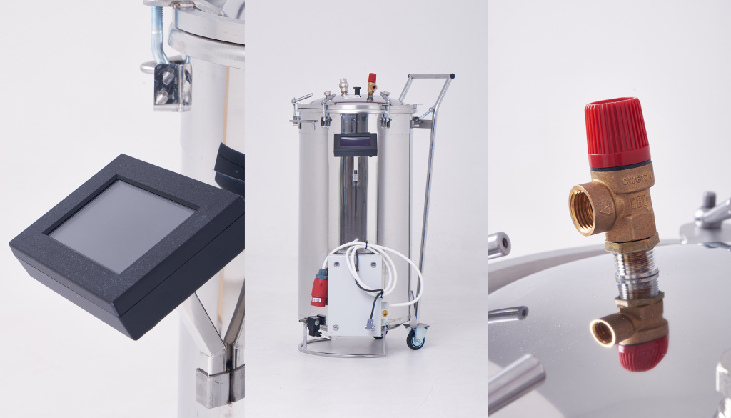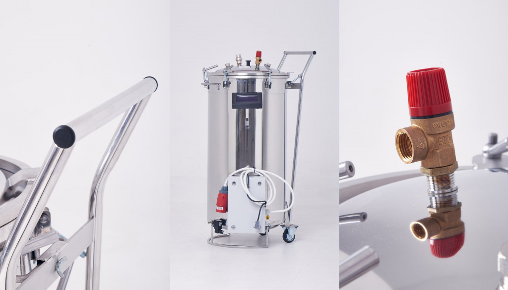 Автоклав для домашнего консервирования с ЭБУ выполнен из нержавеющей стали марки AISI 304, устойчивой к высокотемпературной коррозии. В ассортименте предлагаем автоклавы на 22, 46 и 125 л. При этом, в автоклаве на 125 л колесики и ручка помогают легко перемещать и устанавливать его на любой ровной поверхности.